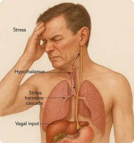 In chronic stress, reduced vagal tone allows unchecked inflammatory signaling. Restoring vagal activity re-engages this natural anti-inflammatory mechanism, reducing systemic inflammation without medication.