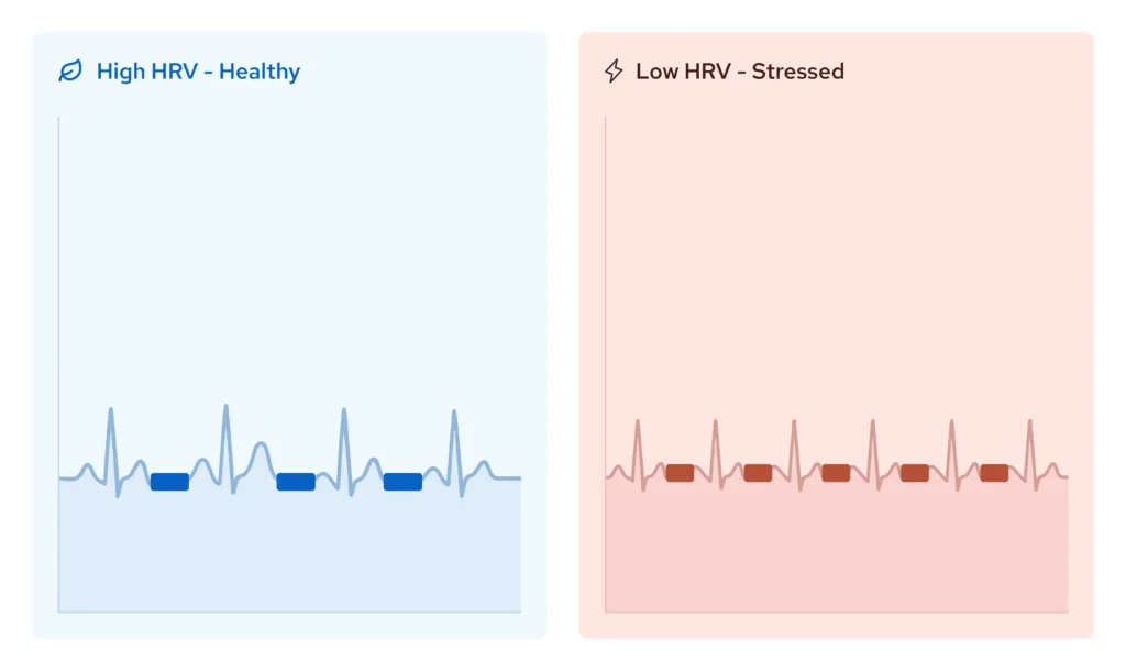 Heart rate variability measures the tiny changes in time between your heartbeats. When that variability is high, it means your body can adapt. It can shift from “go mode” to “rest mode” smoothly. It recovers faster and it handles stress better.