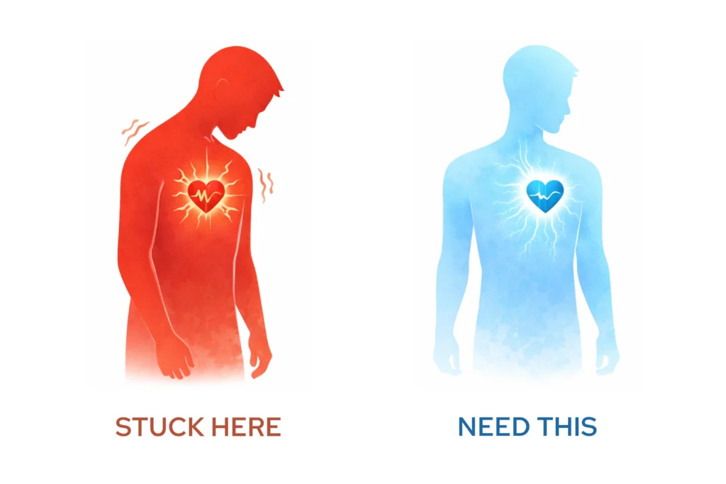 Coffee pushes you harder into fight-or-flight. Supplements don’t flip the switch. Sleep hygiene can’t override a jammed nervous system.