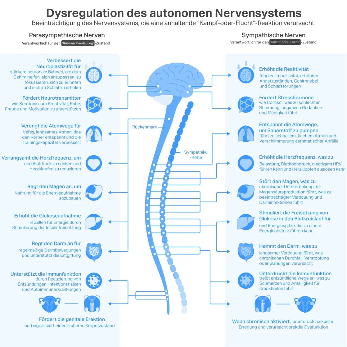 It’s increasingly understood that chronic stress is not just “in the mind” – it is deeply linked to the autonomes Nervensystem (ANS)das unsere unwillkürlichen Körperfunktionen steuert. Wenn sich jemand ängstlich fühlt, ist es eigentlich sein Nervensystem, das in einen Zustand erhöhter Erregung gerät (die Kampf-oder-Flucht mode). Key physical symptoms of stress– a racing heart, fast breathing, tense muscles, stomach butterflies – are caused by a surge of output from the sympathischer Zweig des ANS, das oft als Kampf-oder-Flucht-System bezeichnet wird2. In einem gesunden Szenario schaltet sich der Sympathikus ein, wenn eine Bedrohung vorliegt, und schaltet sich wieder ab, sobald die Bedrohung vorüber ist, so dass der Körper über den Blutkreislauf wieder zur Ruhe kommt. Parasympathikus-Ast (das „Ruhe-und-Verdauungs“-System)2.